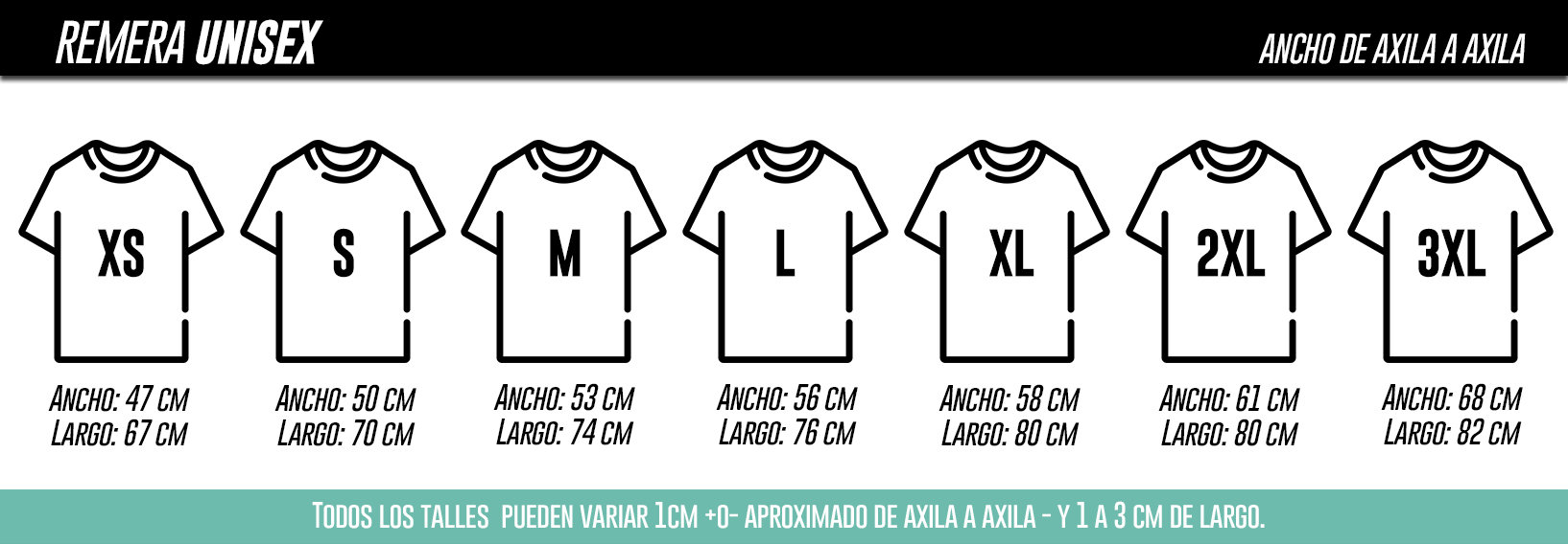 En BAIRES ROPA ESTAMPADA trabajamos exclusivamente con remeras 100% ALGODÓN PEINADO 24/1, asegurado a nuestros clientes un producto suave, confortable, durarero y muy resistente. Doble costura con aguja en cuello, mangas y dobladillo inferior.Guia de Talles